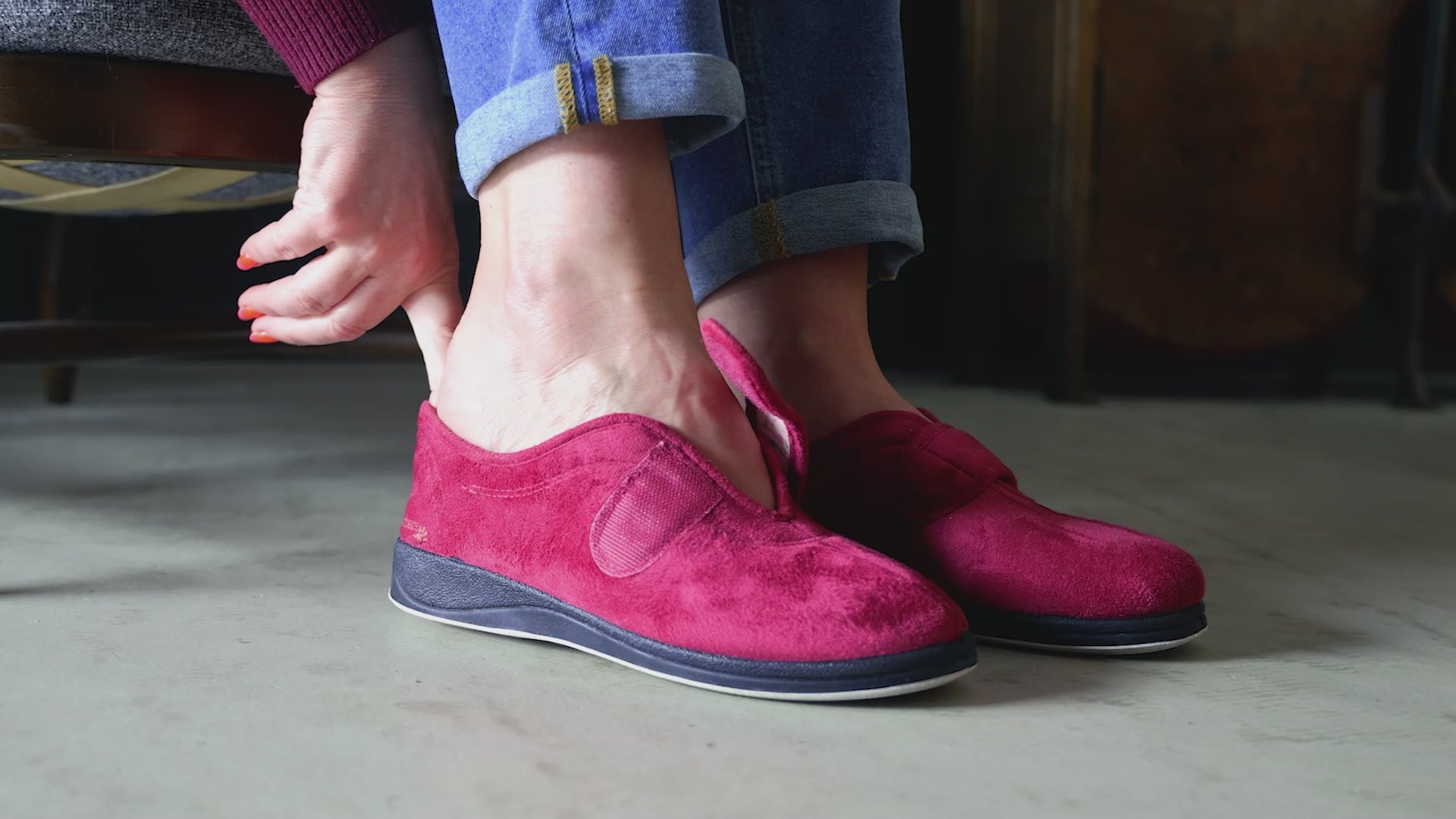 A soft, extra-wide slipper designed for warmth and support. Featuring a memory foam-filled sock and a soft rubber outsole, Camilla cushions every step while offering a spacious fit.
